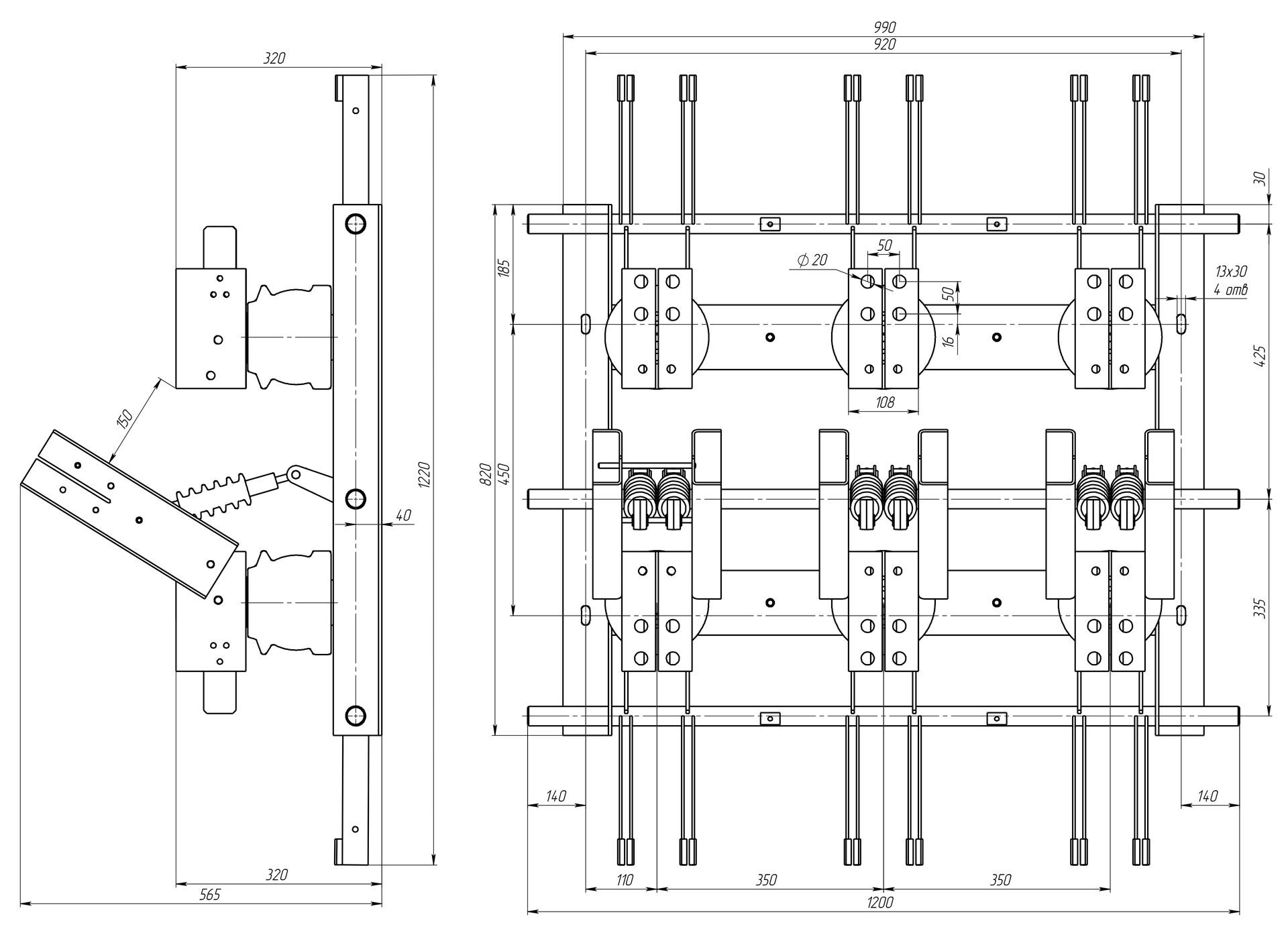 Разъединитель трехполюсный, заземляющие ножи со стороны подвижного контакта.