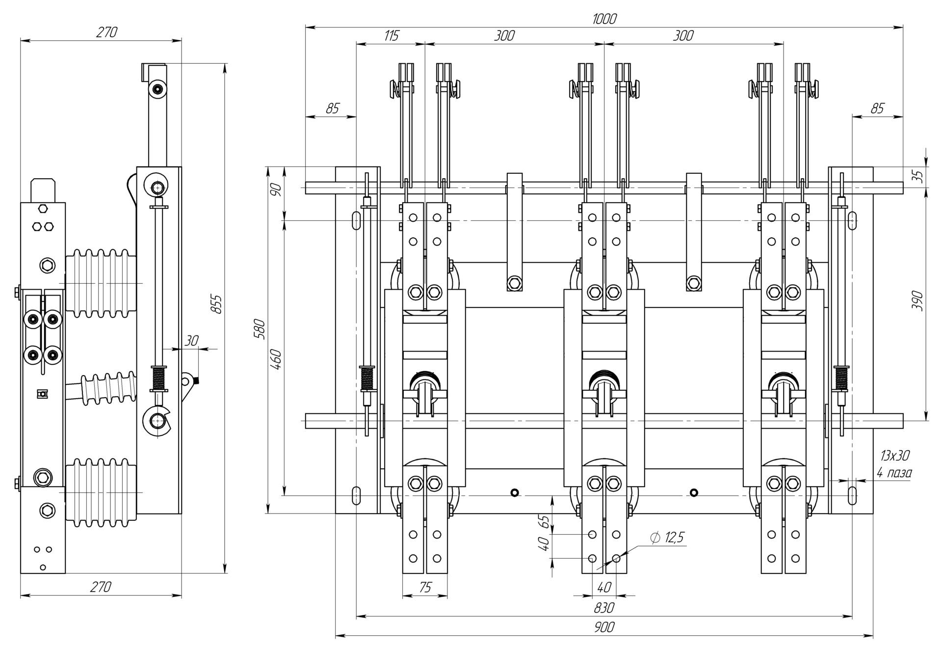 Разъединитель трехполюсный, заземляющие ножи с двух сторон.
