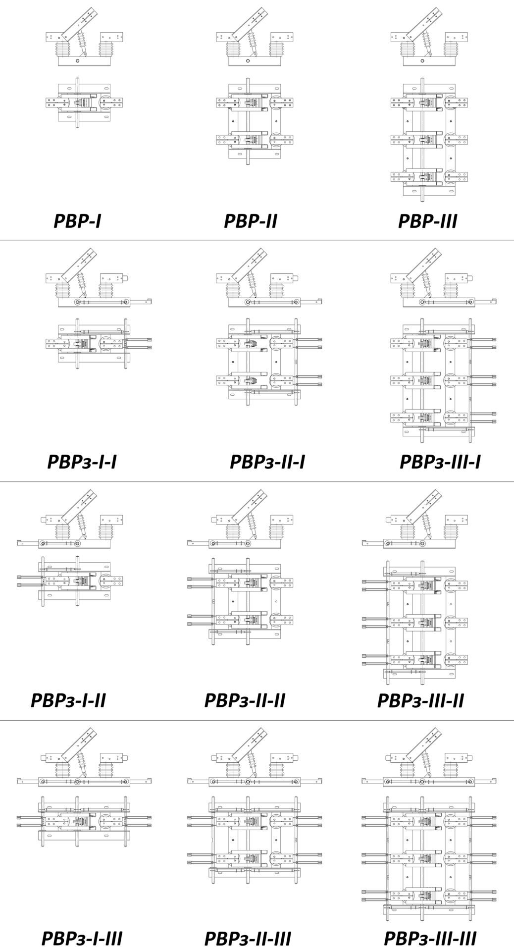 Разъединители серии РВР классифицируются по количеству полюсов и по количеству и расположению относительно подвижных (шарнирных) контактов заземляющих ножей. Первая римская цифра классифицирует по количеству полюсов - I, II и III полюсные. Вторая римская цифра характеризует расположение заземляющих ножей аналогично разъединителям серии РВ
