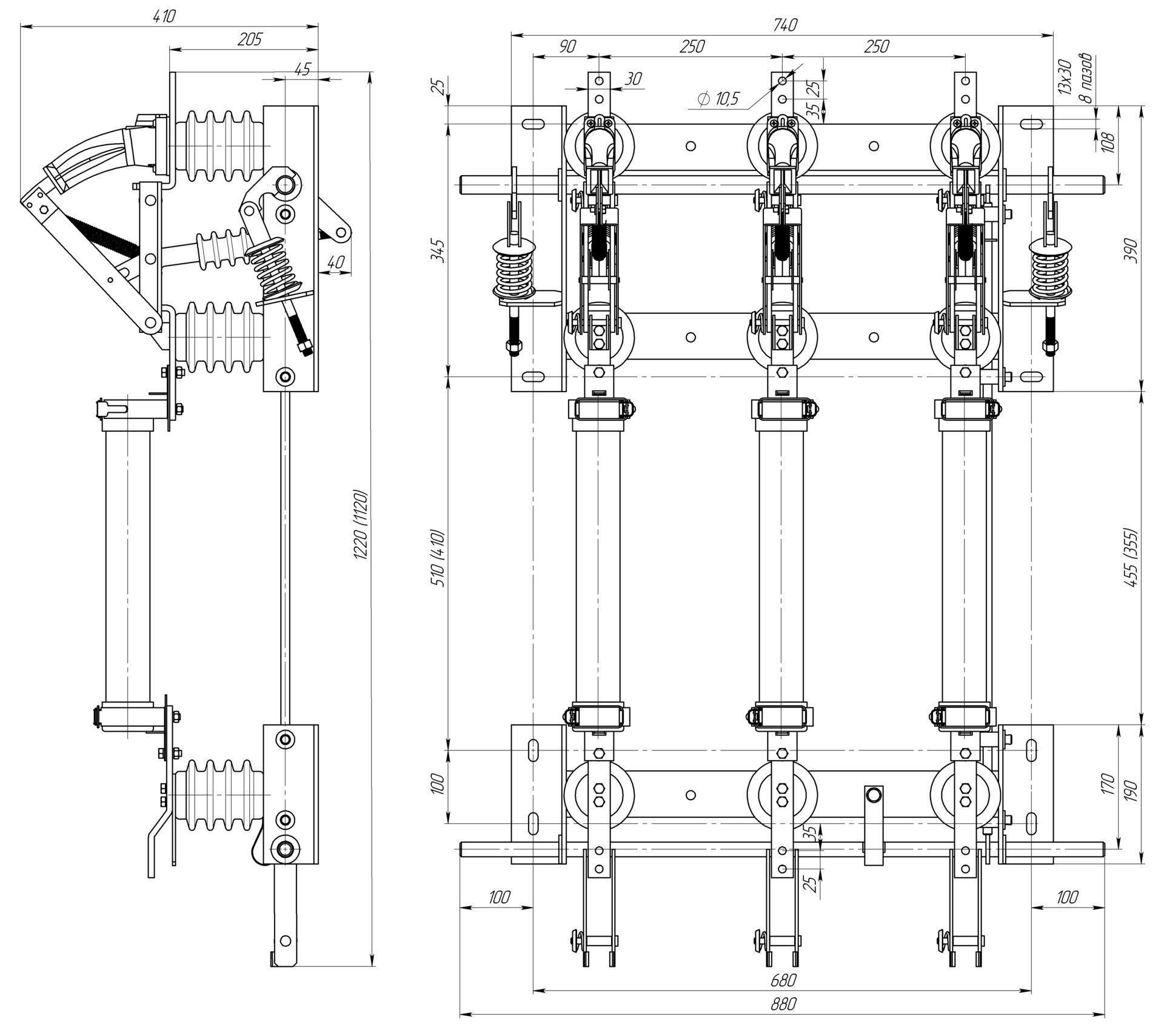 Выключатель нагрузки с правосторонним приводом и полурамой для установки предохранителей серии ПТ. Заземляющие ножи со стороны подвижных контактов.