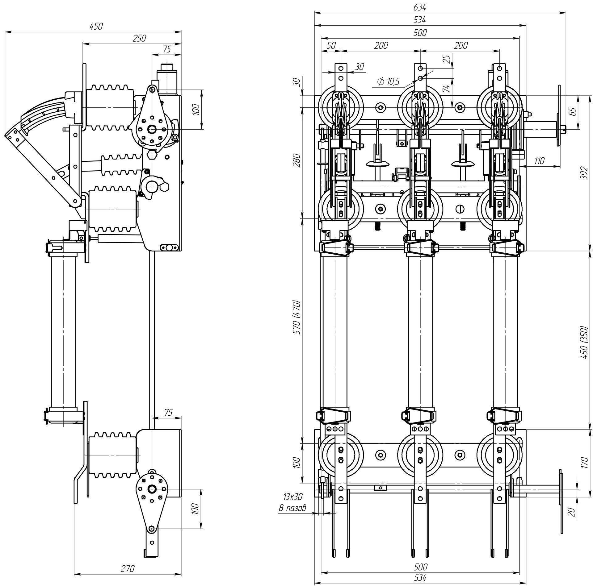 Выключатель нагрузки с правосторонним приводом и полурамой для установки предохранителей серии ПТ. Заземляющие ножи со стороны подвижных и не подвижных контактов.