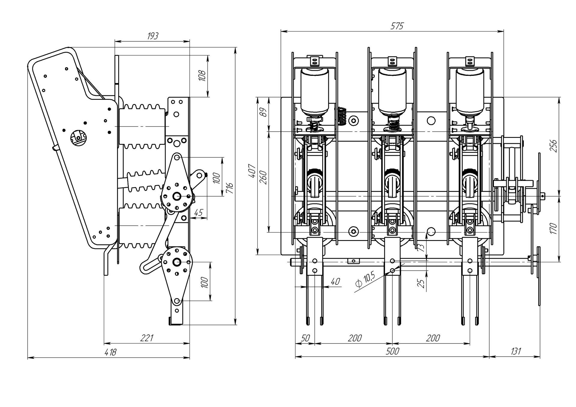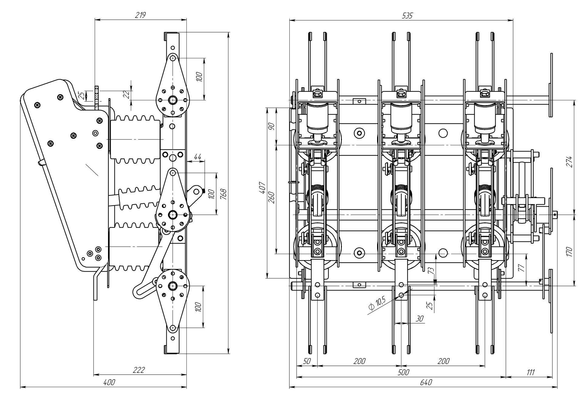 Выключатель нагрузки с вакуумными дугогасительными камерами. Предназначен для отключения токовых цепей напряжением 10 кВ. под нагрузкой. Гашение дуги происходит в безвоздушной среде вакуумной камеры. Исполнение с заземляющими ножами или без заземляющих ножей. С заземляющими ножами возможно три исполнения. I - заземляющие ножи со стороны разъемного контакта. II - заземляющие ножи со стороны шарнирного соединения подвижного контакта. III - заземляющие ножи с двух сторон выключателя